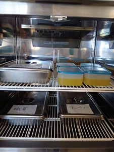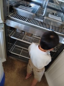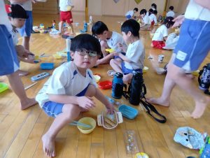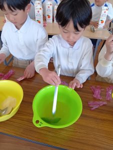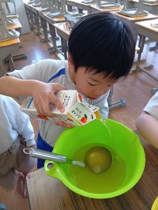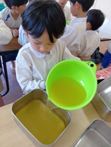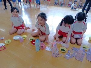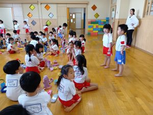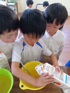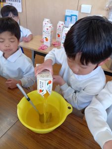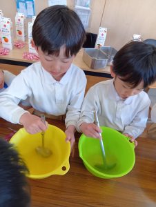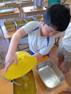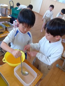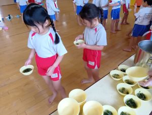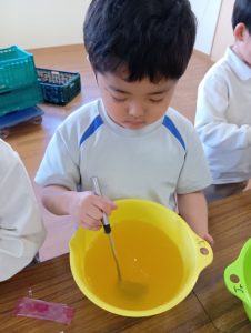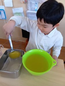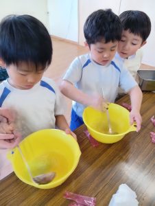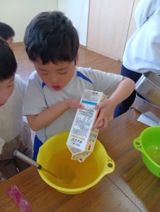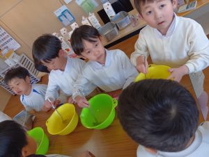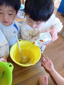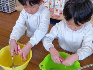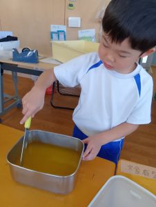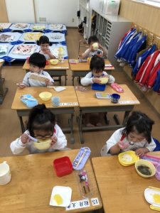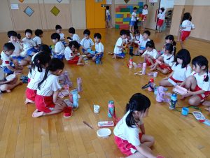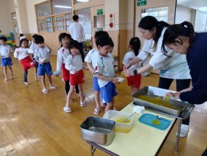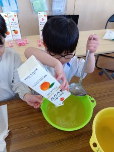 年長組さんには、みんなには内緒で昨日からゼリーを仕込んでもらいました。真剣な顔でゼラチンをジュースにまぜまぜ、ゼリーが入った入れ物をこぼさないように気をつけながら、そろりそろりと冷蔵庫まで運んでくれました。