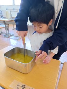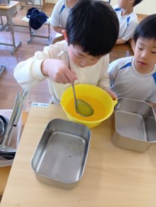 年長さんと一緒に食べる最後の給食・・・何か思い出に残ることはできないかな?ということで、年長組さんと一緒におにぎりを作って食べよう‼ということになりました。おにぎりだけでは寂しいので、お味噌汁とゼリーも作ることに🥄