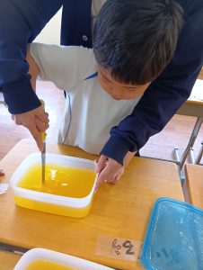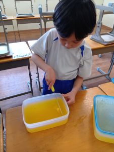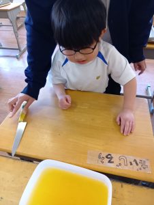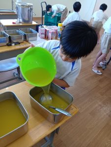 今日、みんなが食べやすいように朝からゼリーを切る年長組さん。