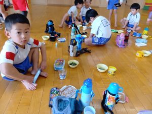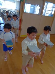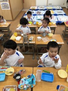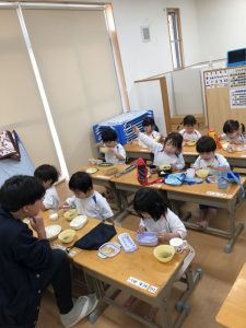 「おにぎりできたよ」「早く食べた~い」「おいしそう」とわくわくが止まらない子どもたち。みんなでいただきますをすると「おいしいね」「おかわりください」と食欲が止まらない~(笑)年長組さんにとっても幼稚園最後の給食はとても楽しく思い出に残る物になったようです。