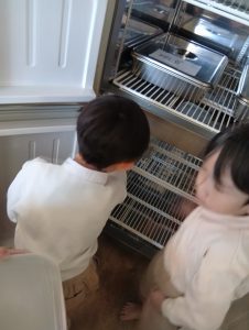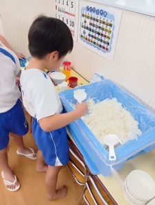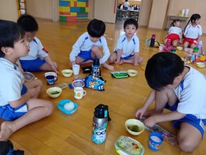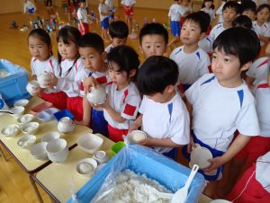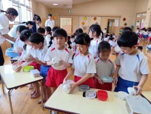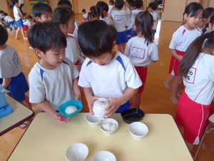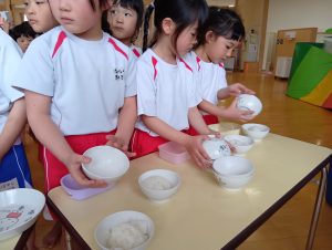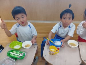 年中組さんと年長組さんは自分のおにぎりは自分で作りましたよ🍙お茶碗にご飯をよそい別のお茶碗で蓋をしてフリフリ、フリフリ。世界に一つしかない自分だけのおにぎりが完成しました。