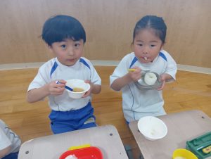 昨日から準備してくれていたゼリーも大好評💖ナーサリー組の子どもたちにもデザートとしてプレゼント。0歳児さんも1歳児さんもおいしそうに食べてくれました。