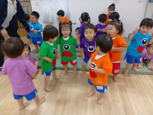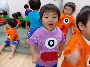 カラーTシャツに手形をペタペタとスタンプし、目と口をつけて衣装をつくりました🎶