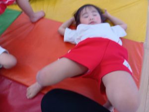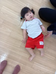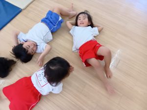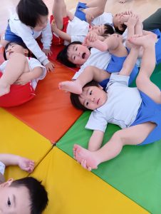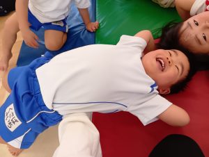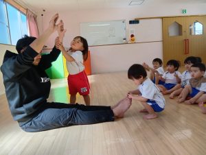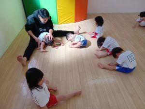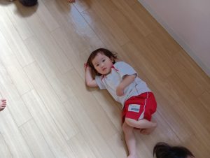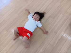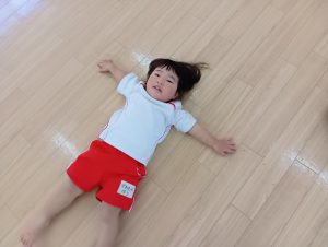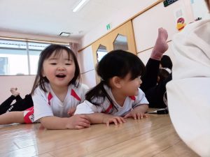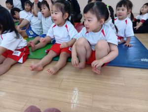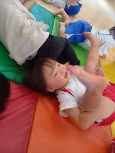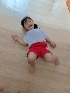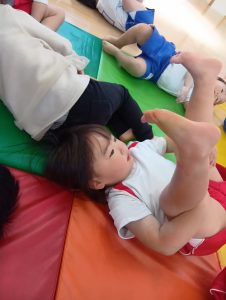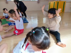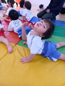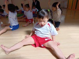 以前から、「開脚よういー!」の練習をしていたので、「開脚ようい」の声かけで手をピンと上にあげ、足を開くことができるように✰