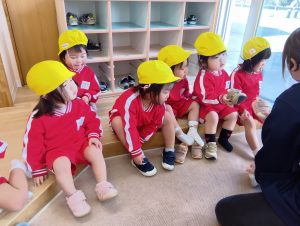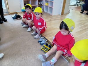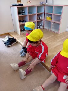 すこし難しくてできなくても、「できない!」といってやめるのではなく、がんばって履こうとする姿がみられます!