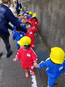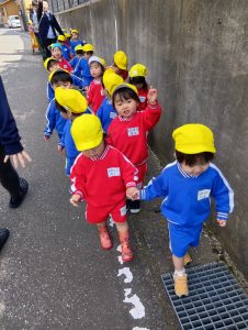 ちなみに、手を繋ぐペアは、「さっお友達と手をつないでね~」という先生の声かけで自分たちでお友達を探して手を繋いでいます(笑)