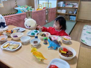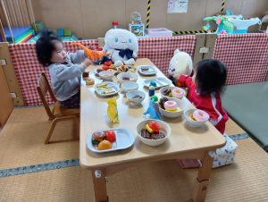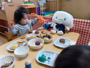 お皿に食べ物の玩具を沢山乗せてごちそうをつくっていましたよ🎶