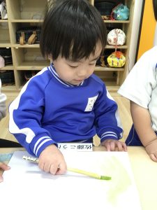 すこし難しくてできなくても、「できない!」といってやめるのではなく、がんばって履こうとする姿がみられます!