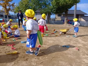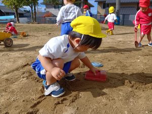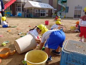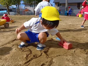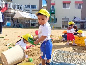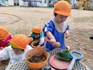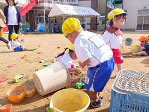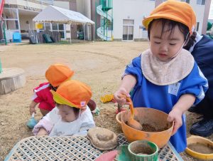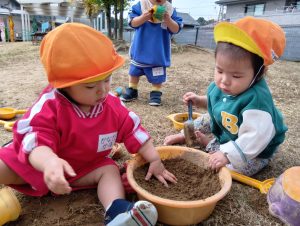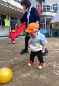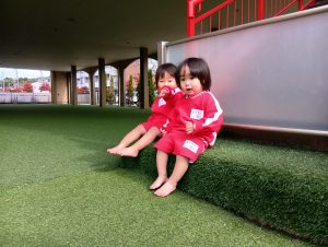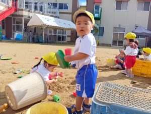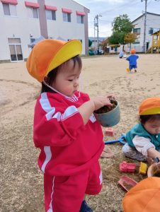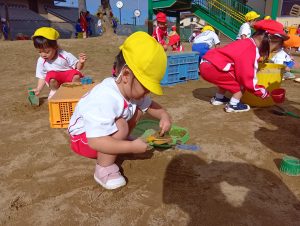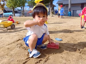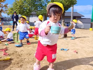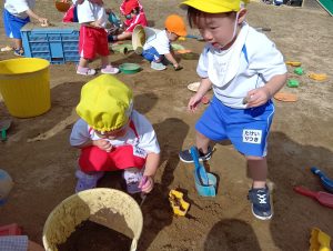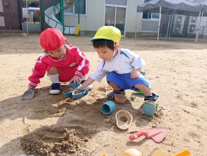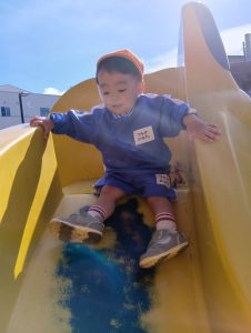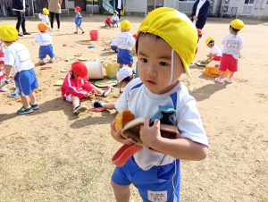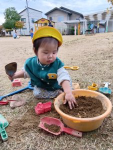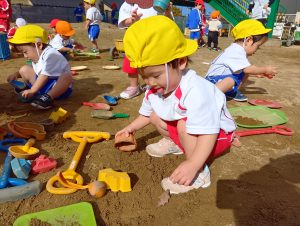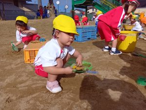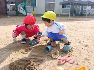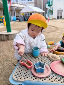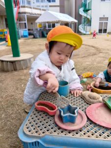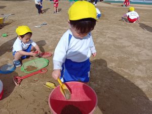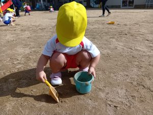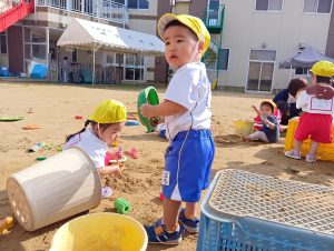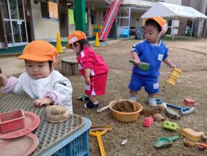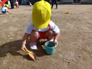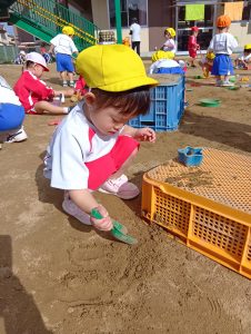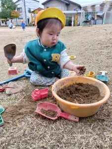 もう慣れっこの園庭!園庭デビューの時には涙していた子も今ではへっちゃら!お兄さんお姉さんにたくさん可愛がってもらったり、お砂遊びに没頭したり、ひろーい園庭を走りまわっています♡