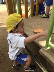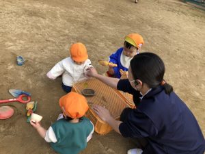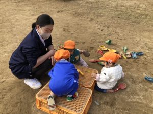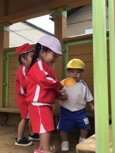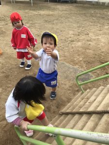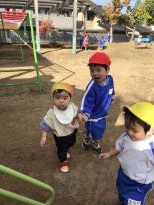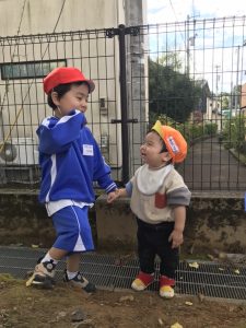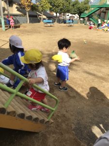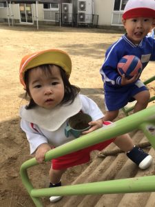 もう慣れっこの園庭!園庭デビューの時には涙していた子も今ではへっちゃら!お兄さんお姉さんにたくさん可愛がってもらったり、お砂遊びに没頭したり、ひろーい園庭を走りまわっています♡