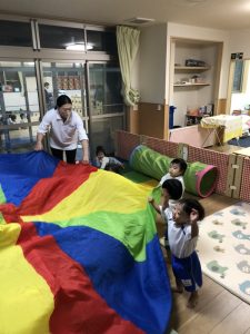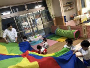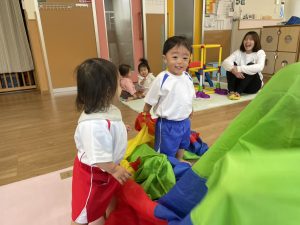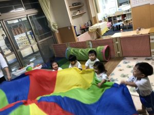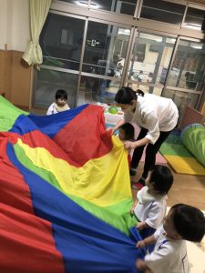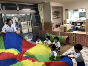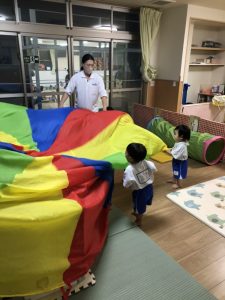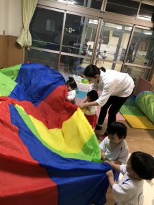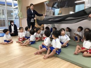 この黒い布は北風を表しており、このお歌になると子ども達は興奮(笑)