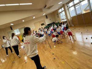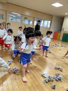先週、各クラス新聞紙で玉を作りました。