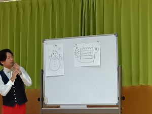 また、絵描き歌では「なにかな?なにかな?」と徐々に完成する絵を見ながら考え「あ!雪だるま!」「ケーキ!ケーキ!」と楽しんで絵描き歌を見ていました。