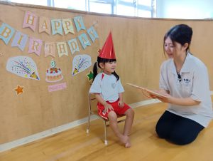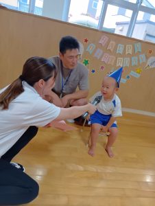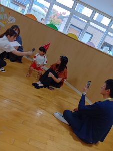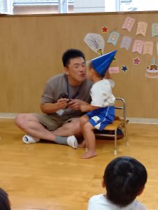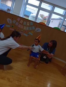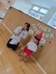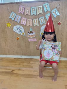始めはちょっぴり恥ずかしがっていましたが、「おたんじょうびおめでとう」の言葉や、歌を歌ってくれたことに嬉しくなり可愛い笑顔が見られました。