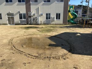ひよこの先生が描いた水たまりのまわりの丸。入らないよ〜の丸をしっかり守る年少組✨