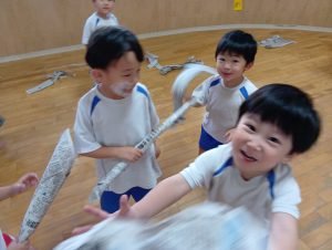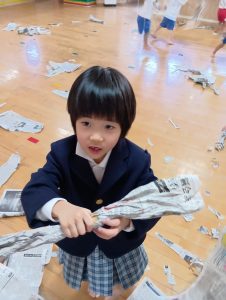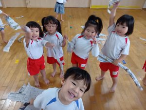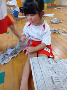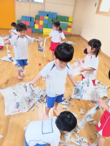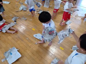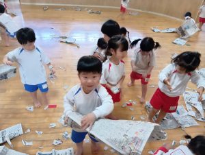 ですが、室内遊び何するー?と聞くと「なんか作るー✂」と子ども達から声があったので新聞紙遊びをしました✨