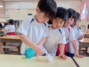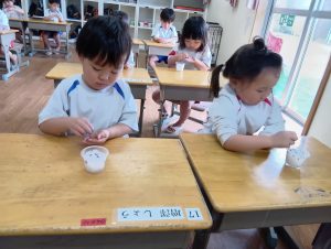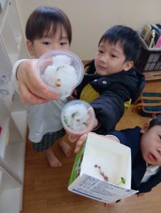 「あ!葉っぱがでてる!!」とお友だち同士で話したり「先生みてみて!」と教えてくれています!