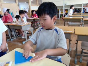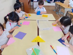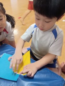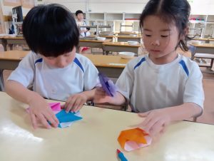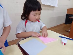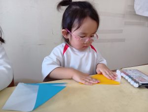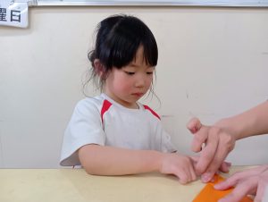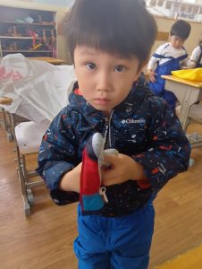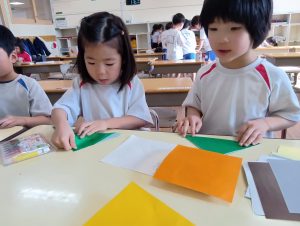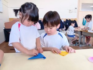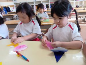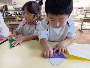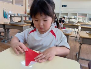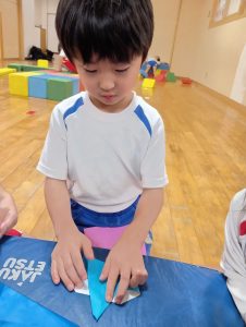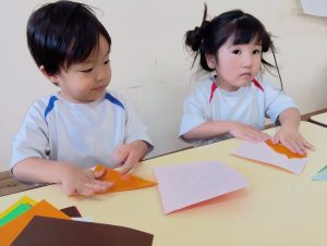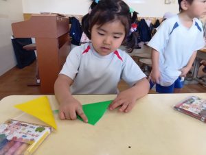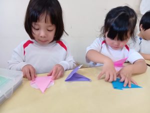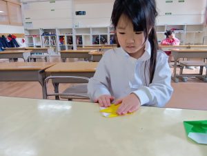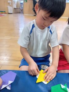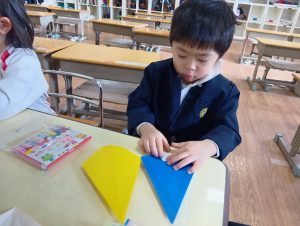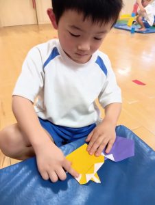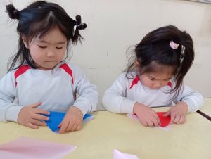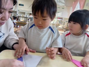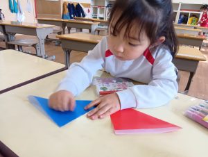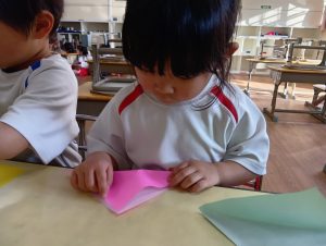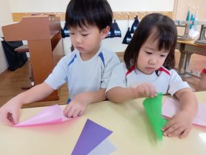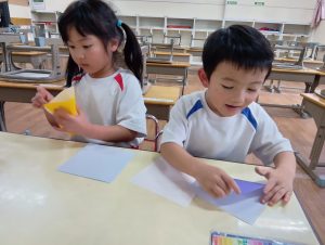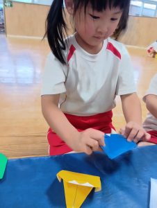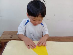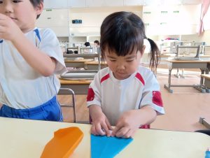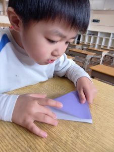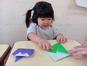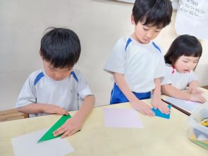 自分たちで紙飛行機を作って遊んだりしているので、2月の制作は折り紙で鬼を折ってみました!👹