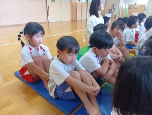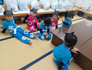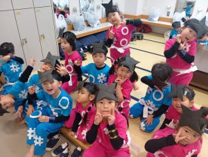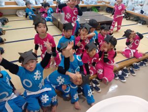 体操は忍者になりきり、手裏剣を的に当てるにはどうしたらいいのか矢代先生にもアドバイスをもらい、さらに上達し、「ニーン🥷」とカッコよくポーズを決めることもレベルアップ!!