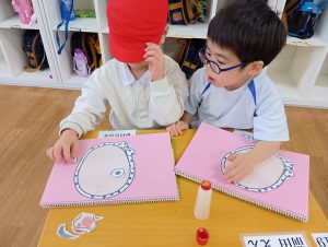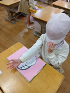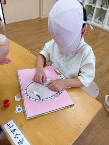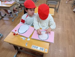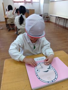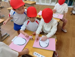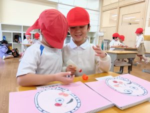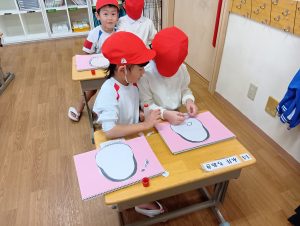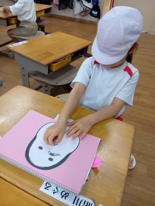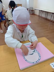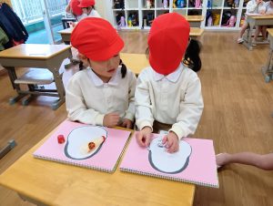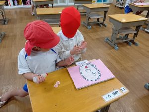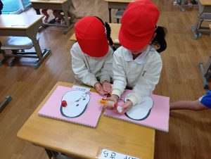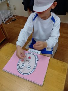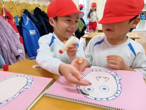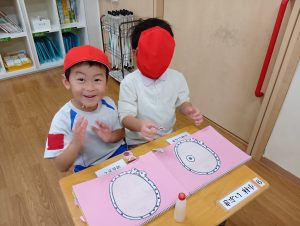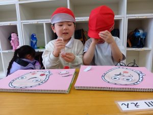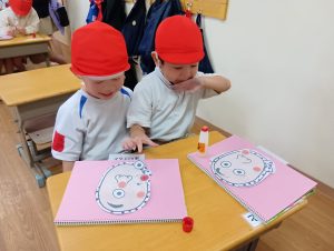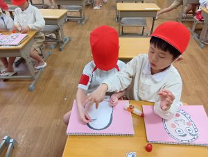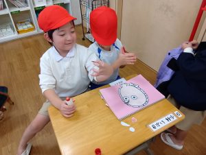 赤白帽子をずらしてチラ見する子や、豪快にどんどん貼っていく子など、色々な子がいて見ていて面白かったです(*´艸`*)
