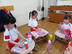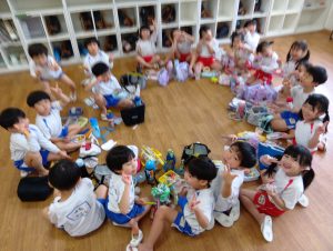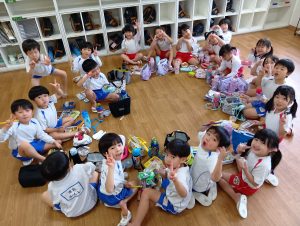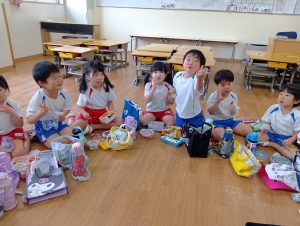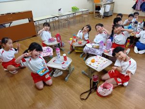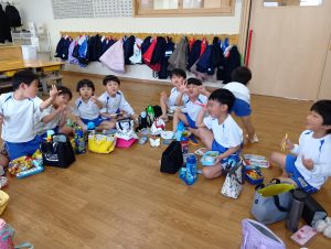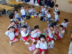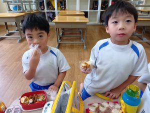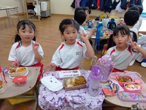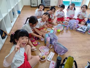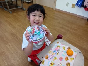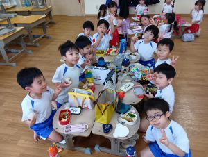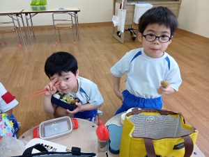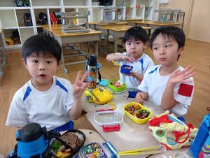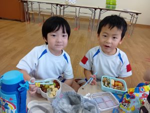 可愛いお弁当箱や保冷剤をお友達と見せ合って、食べる前から大盛り上がりの子どもたち(*´∀`*)♪