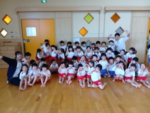 ※終業式後の集合写真ですが、年中組が終わってしまうのが寂しくて泣いてしまった子はしょんぼり顔です…💦