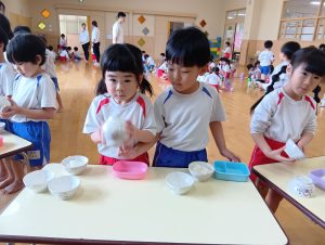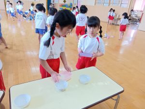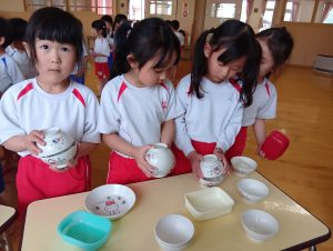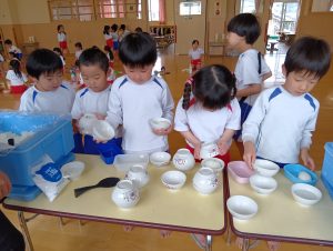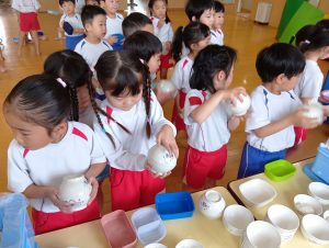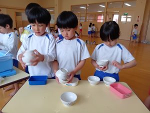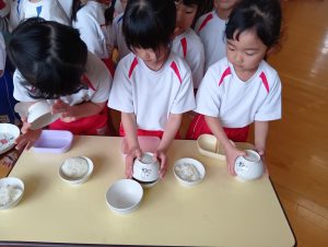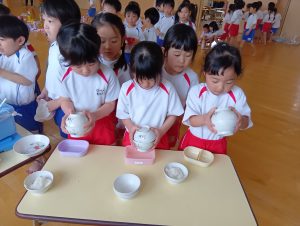 最初は恐る恐るお椀を振っていましたが、だんだんと慣れてきたようで強く振ることができました♪