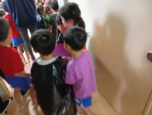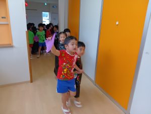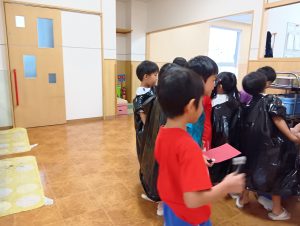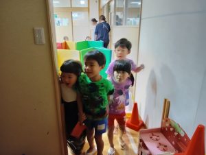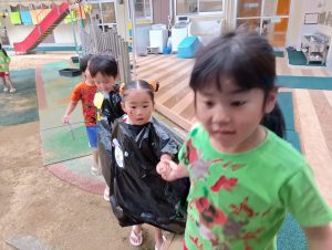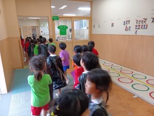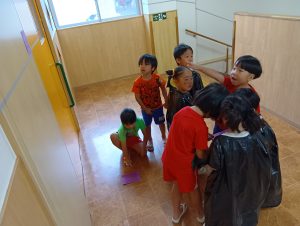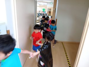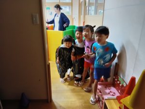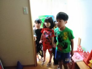 まずは年中年長1組が探しに行きます。