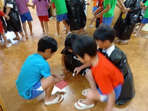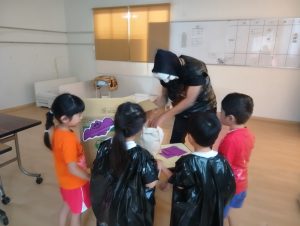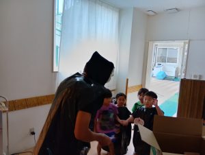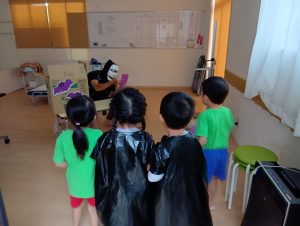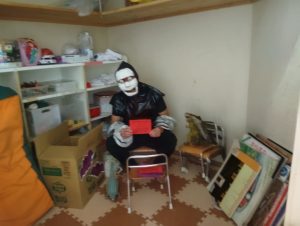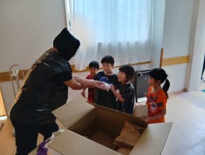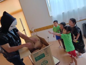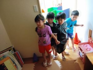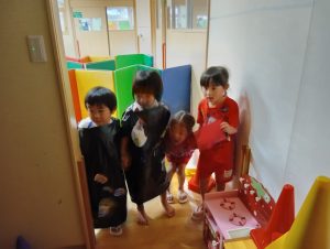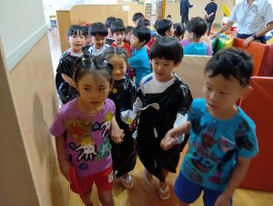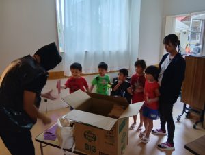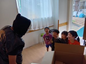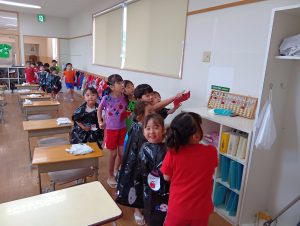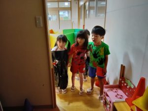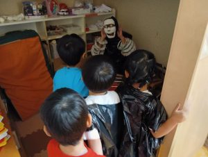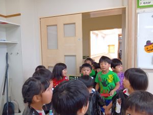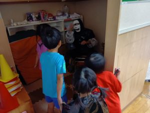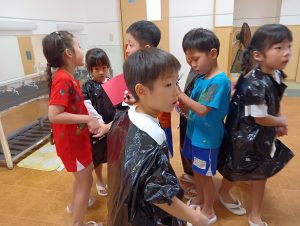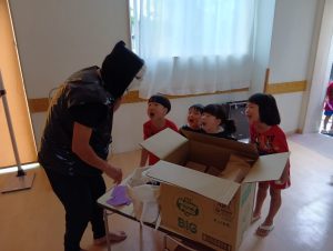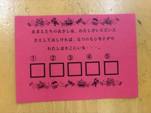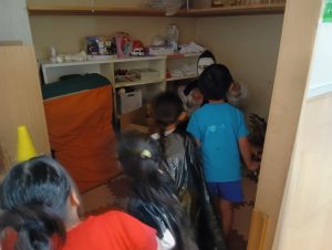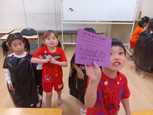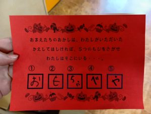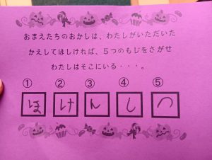 お菓子を取り返すべく、急いで年中組と年長組で5つの隠された文字を探しに行きました👻🔍