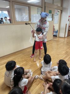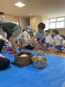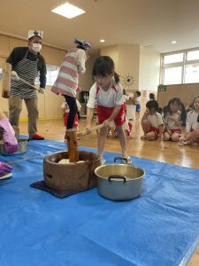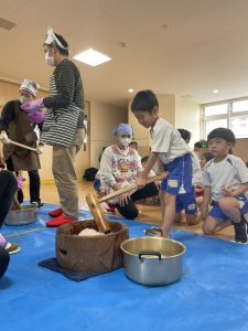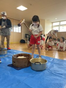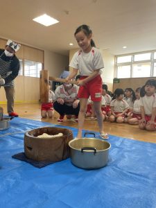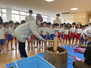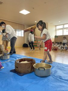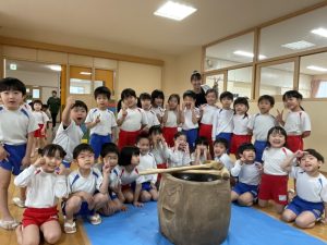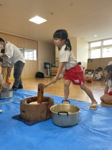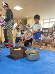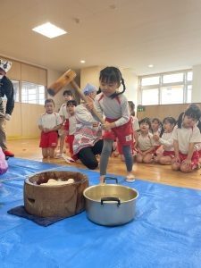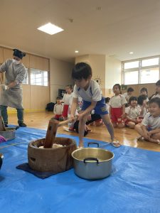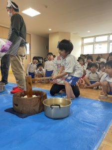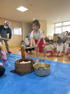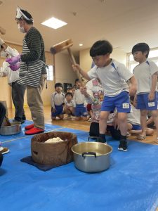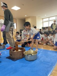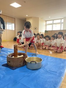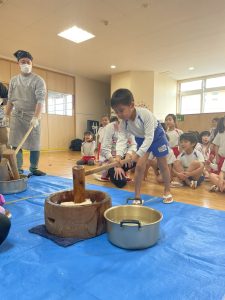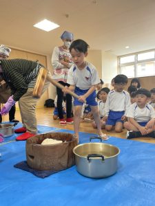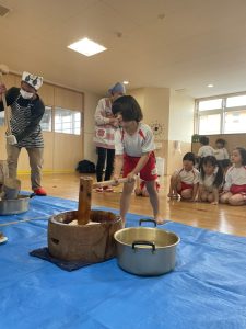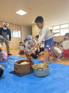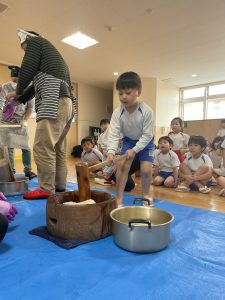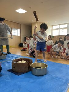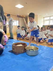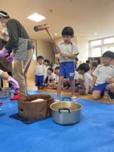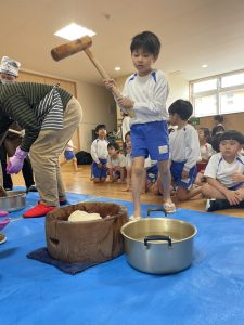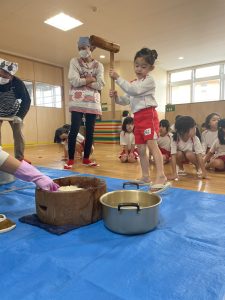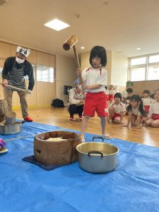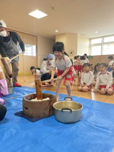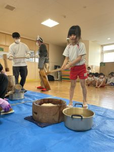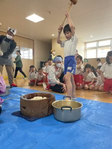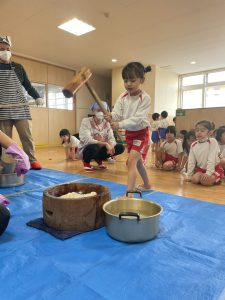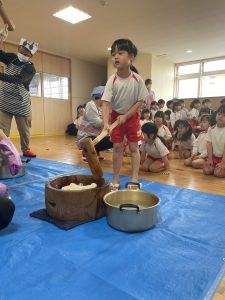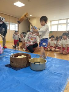 重たい杵をしっかりと持ち「よいしょ!!」と元気よく掛け声をかけながら一生懸命に叩いている子ども達でした😊
