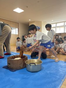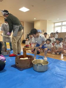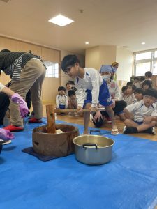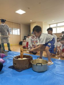 餅つきを始める前に餅つきの由来を聞いたり、蒸しあがったもち米を食べてみたりと普段ではできない体験をたくさんした子ども達✨