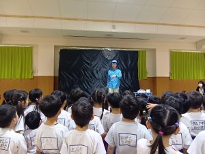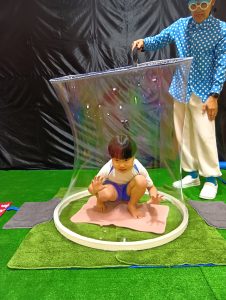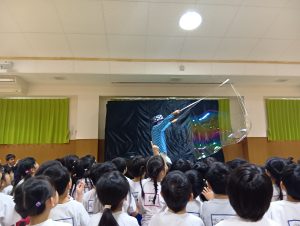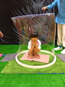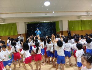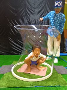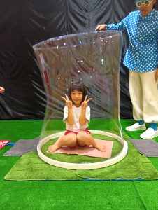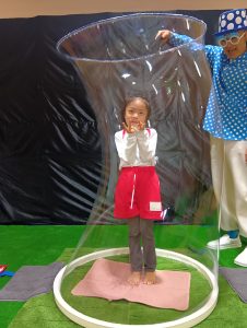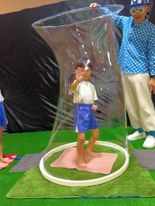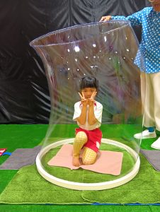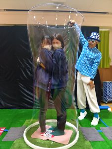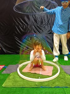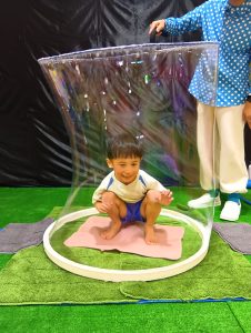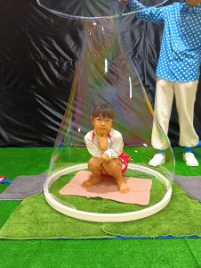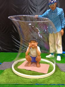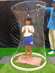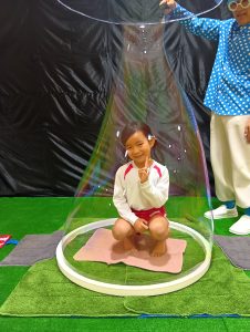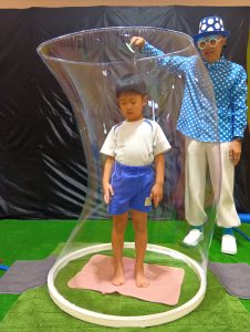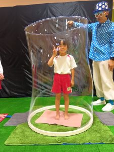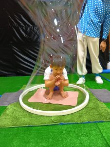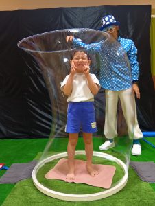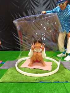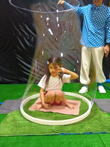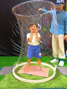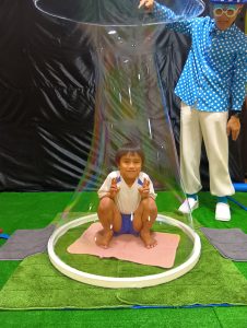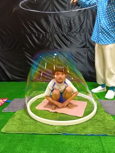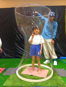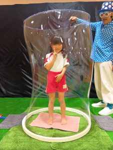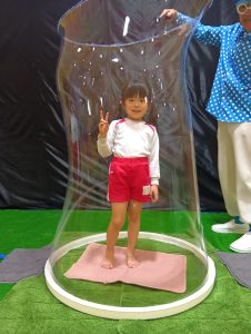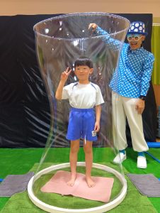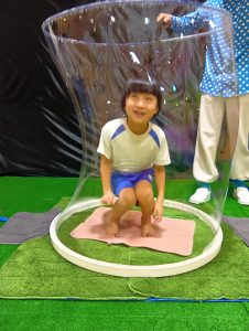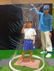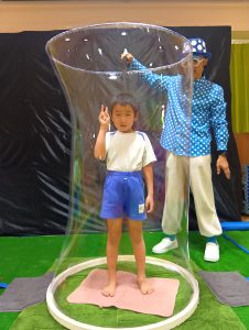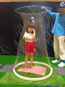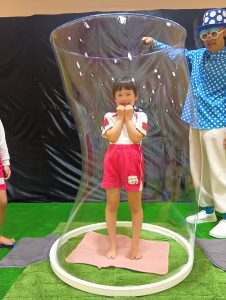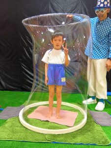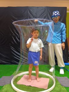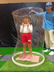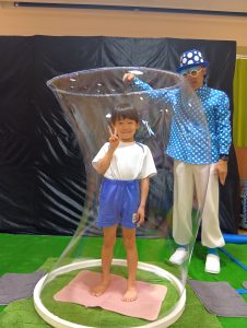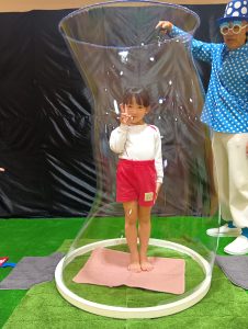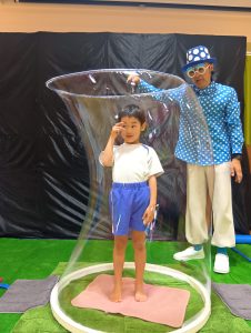 シャボン玉のショーを観たあと、年長組は大きなシャボン玉の中に入ることができて1人ずつ記念撮影できました✨