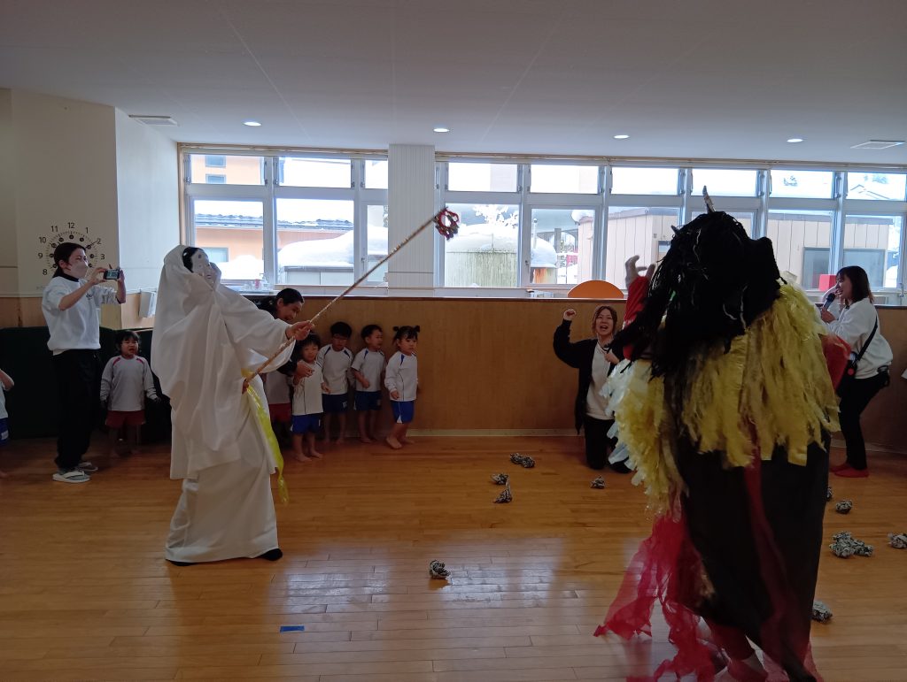 そこへ、福の神が現れ、みんなで「鬼は外!福は内!!」の掛け声で、鬼は山へ帰っていきました。